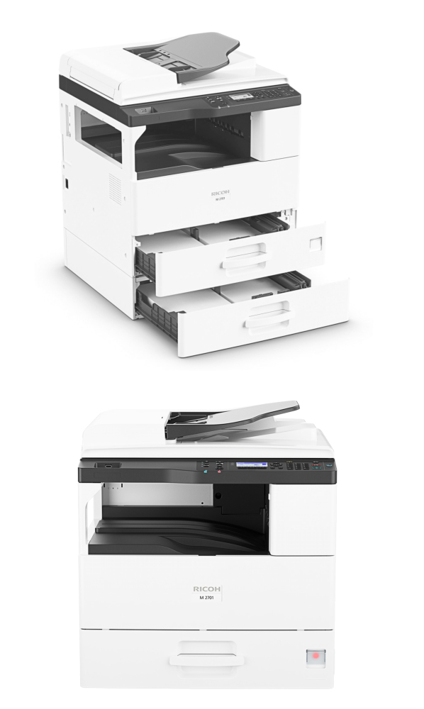 RICOH M 2701 je novi, „smart“, A3 multifunkcijski c/b štampač, niske nabavne cena, nudi mnoštvo poboljšanih funkcija koje olakšavaju korišćenje i povezivanje, istovremeno povećavajući Vašu produktivnost. M 2701 nudi već u brzinu štampanja, od 27 stranica u minuti, veće standardne fioke za papir kao i novi 7-inčni upravljački displej za veoma jednostavan rad. Minimalna tehnička podrška je potrebna za podešavanje uređaja jer su mrežna kartica i ARDF unapred instalirani Lako štampanje ili skeniranje dokumenata sa mobilnih uređaja putem aplikacije Ricoh Smart Device Connector Podrška za aplikacije koje se povezuju na „cloud“ i preko platforme RICOH Smart Integration. Nova generacija 7-inčnih upravljačkih panela pruža jednostavan pristup informacijama direktno sa uređaja na brz i siguran način RICOH Intelligent Support servis i alati pomažu Vam da brzo i lako rešite probleme.